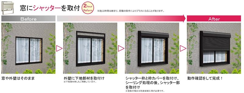 シャッターを壁の上から取り付けて一か所、約2時間で施工完了。