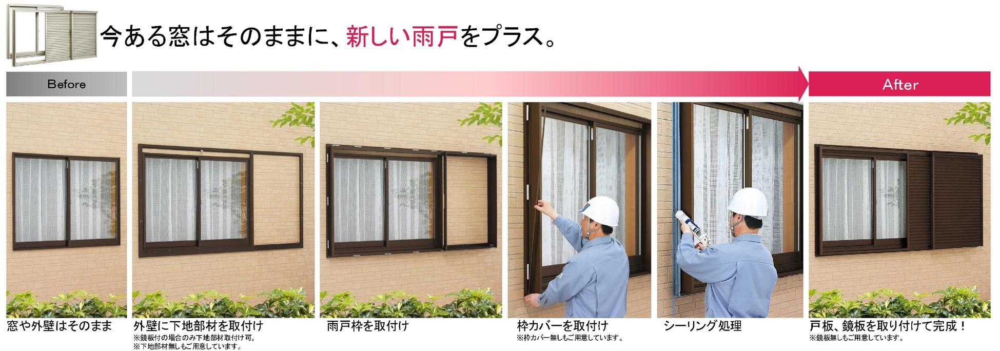 雨戸を壁の上から取り付けて一か所、約3時間で施工完了。