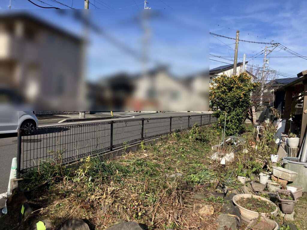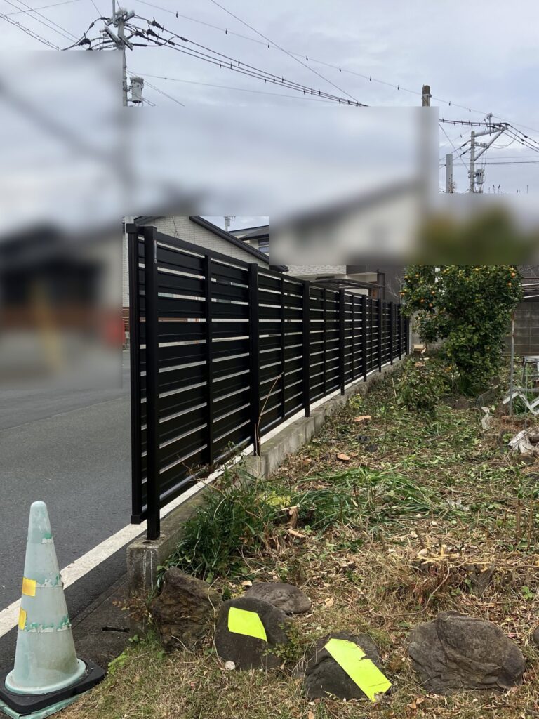 樹木の伐採後、既存のフェンスを取外して新しくフェンスを取付けさせていただきました。